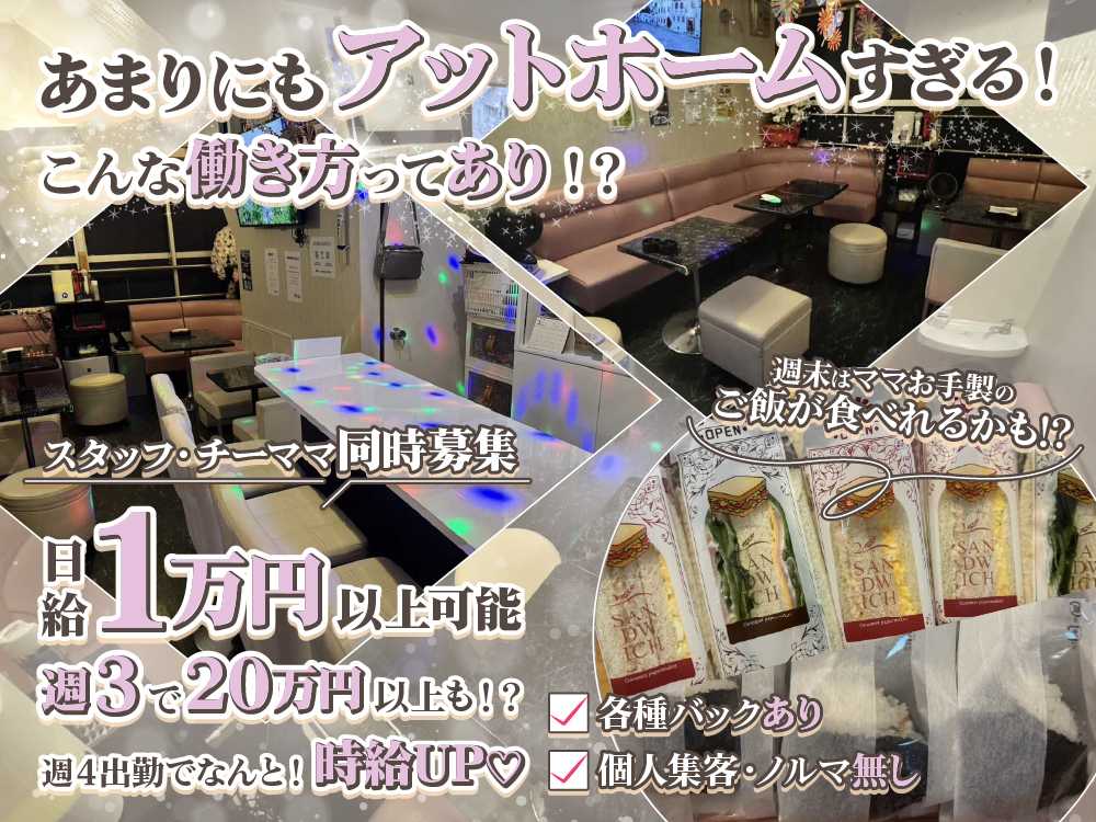 とってもフレンドリーなママのいるスナックです♪★25~40歳まで幅広く活躍中!キャバクラが苦手な方にピッタリ!面白いママのいるお店で一緒に楽しく始めませんか?未経験者、学生、OL、主婦、みんな歓迎!簡単なママのお手伝いです!カラオケや楽しい会話でママとスタッフ皆で一緒に盛り上がりましょう♪お酒が飲めなくてもOK!お客様はサラリーマンの常連さんメインに20代~60代まで幅広く来店♪女の子同士もワキアイアイとした雰囲気が◎なお店です♪