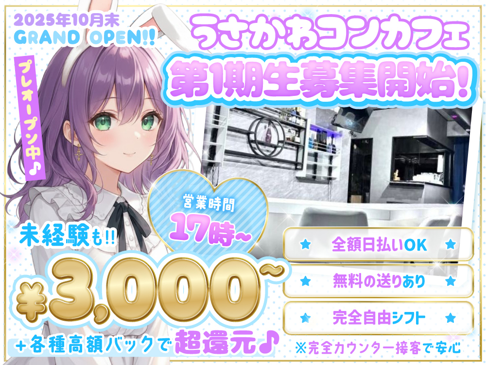 完全新規OPENのため 上下関係や派閥・グループ一切なし💕 『女の子同士みんなスタートが一緒だから 他のお店と比べて安心感が全然違います😁(笑)』 ピリピリ・ギスギスした空気感もゼロです💕 また、"嘘や偽り"が多い ナイトワークの給与システムですが... 給与システムはわかりやすいので一切心配なし💕💕 きちんと明細もお渡ししますし お渡しの際に個別で説明&確認もするので安心です😌 "100%"カウンター接客のため お客様の隣に座っての接客は "絶対に"ありません❗❗ 即日面接や体入も大歓迎です🐣 是非ご応募ください✨💕