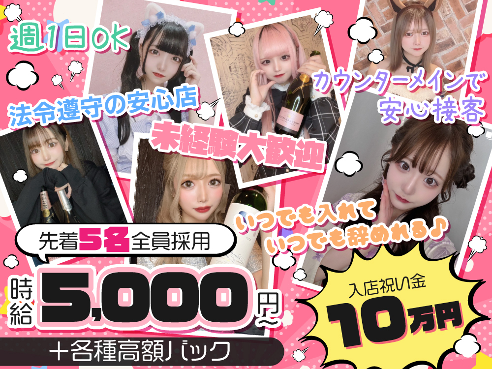 とにかくゆる~く働ける "かふぇ&ば〜"が GRAND NEW OPEN しちゃいました💕💕 完全新規OPENのため 「派閥」や「上下関係」とは 一切無縁のお店です😌💕 オープニングの今だけ限定で... 面接先着10名の女の子 を全員採用しちゃいます🐣💕 未経験者さんでも初心者さんでも お友達同士での 〈ニコイチ✌〉〈サンコイチ🤟〉 でのご応募でも 10人になるまでは "必ず"全員採用しちゃいます🐣🐣 時給は【時給3500円】以上🐣💕 さらに【全額日払いOK】だから、 お財布がピンチな方もこれで安心です🐹 即日面接や体入も大歓迎です🐣 是非ご応募ください✨💕