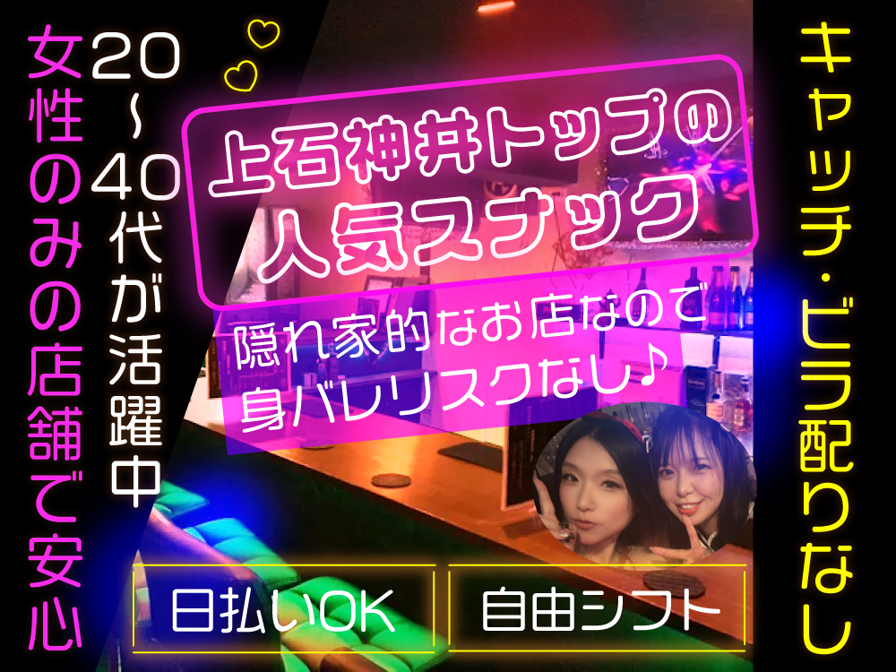 上石神井駅チカにニューオープン✨ 女性スタッフだけのスナック【Sp-Ace】で一緒に働きませんか?💖 初めて夜のお仕事をする方でもノルマ・罰金なしで安心してスタートできますよ!🙅♀️ 時給1,500円~+高額バックありで、頑張った分はしっかりお給料に反映💸 週1日~、終電までの勤務もOKだから、プライベートやWワークとの両立もバッチリ👍 土日営業で効率よく稼げるのも魅力!髪色・ネイル・タトゥー自由で、あなたの個性を活かして私服で働けます✨ 履歴書不要で友達同士の応募も大歓迎👭💕 まずは複数回の体験入店で、お店の雰囲気を確かめてみてくださいね😊