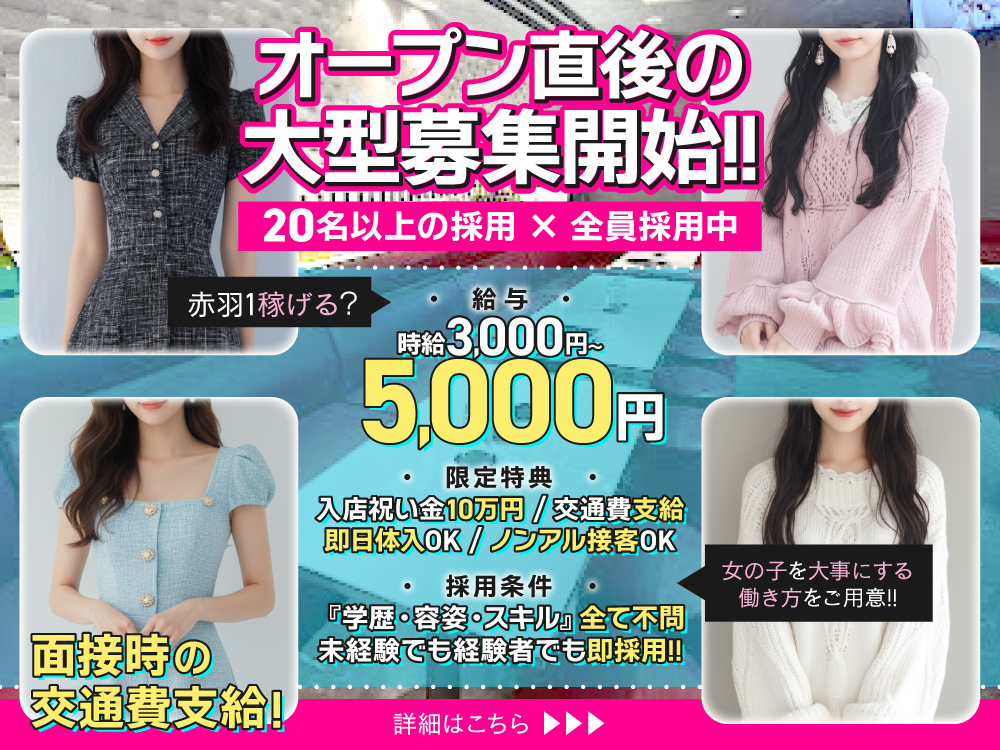 長時間勤務可能なお店!早出~終電迄大歓迎! 早出⇒終電まででも時給は変わりません。終電以降は随時送りができます。 学生・OL・主婦・フリーター大歓迎!幅広い年齢の女性が活躍していますので、年齢気にせずに働けますよ! 女の子同士の仲も良いアットホームな雰囲気です。 月2回の現金受け渡し。時給・歩合は出勤日数により上がります!日払いも可。 不安や疑問は、なんでも聞いてください。スタッフが親身になって相談に乗ります! ドレス・スーツ・小物アイテムも豊富に揃えてます!手ぶらで勤務オッケーです、お気軽にご応募ください♪