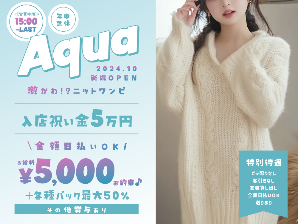 \✨今がチャンス✨/ ラウンジアクアでは、超積極採用中💙 初心者さんも経験者さんも大歓迎! ノルマや罰金は一切なしで、楽しくゆるく働ける環境です🎶 時給5,000円~+売上50%バック💰で高収入を目指せます♪ さらに《時給永久保証》や全額日払いOKなので、 安定した収入をGETできますよ✨ 無料の衣装レンタル👗や専用ドライバーでの送り🚗も完備しているので、 手ぶらで安心して働けます😊 まずは体験入店からスタートしてみてください🌈