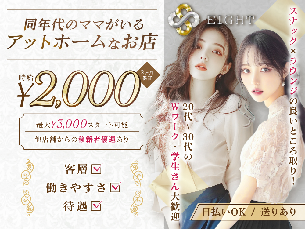 スナックとラウンジのいいとこどり⁉《EIGHT》では、未経験でも安心して働けるアットホームな環境💖【体入時給最大3,000円】日払いOK💸急な出費にも対応できるのが嬉しいポイント!さらに、ノルマや罰金なしで、気軽に働ける✨自由シフト制で「週1日~」や「1日3時間~」など、ライフスタイルに合わせた勤務が可能♪送りも完備しているので安心して帰れます💨気軽に体験入店してみませんか?