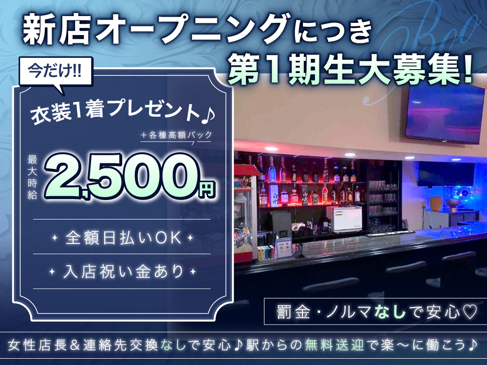 🎉12月新規OPENのガールズラウンジ「BOO~ブー~」で一緒に働きませんか?🎉未経験でも安心のナイト初心者OK&派閥なしの環境で、優しい女性店長が丁寧にサポートします✨お仕事内容はおしゃべりと簡単なドリンク作りだけ!私服勤務OKでノンアルでも活躍可能🍹週1日~、終電あがりもOKな完全自由シフト制だから、自分のペースで働けます💕高額バック&全額日払いOKで、急な出費にも安心♪今だけ入店祝い金や衣装プレゼントなど特典多数!ぜひ体験入店でお店の雰囲気を感じてください✨