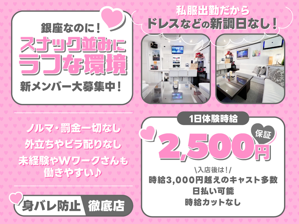 銀座ラウンジ「リベルラ」では、受付スタッフを大募集しています✨未経験歓迎で、時給2,500円以上&自由シフト制が魅力的♪お仕事内容は予約受付や簡単な清掃など、接客の負担は少なめ!髪型・髪色やネイルも自由で、ジュアルスーツの貸出や個人ロッカー完備だから働きやすさ抜群です😊交通費&面接交通費支給で、週1日・3時間から勤務OK!登録制や短期希望も大歓迎なので、自分のペースで始められますよ💼終電上がりOKで安心♪ぜひご応募ください📲