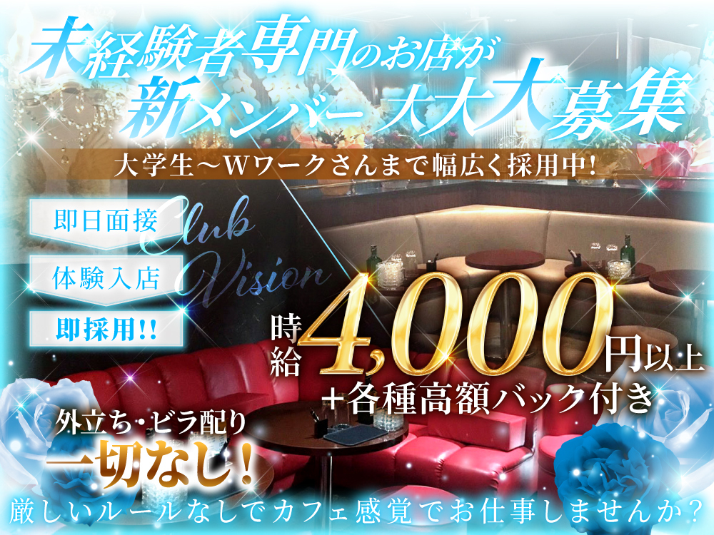✨Club VISION ~ヴィジョン~✨は小作エリアで大人気のキャバクラ💖 立地は小作駅からすぐ👣ドレスレンタルが無料で毎日違う自分を演出できます👗💕 体入時給は3,500円保証💰更にバックも充実🌟全額日払いOK💸 罰金やノルマ一切なし🙅♀️入店祝い金あり🎁お店からの送りもありで安心🚗週1日3時間からOKでライフスタイルに合わせた働き方が可能👍💫ヴィジョンで新しい一歩を踏み出しませんか💖