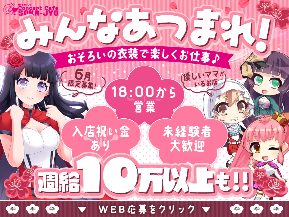🏯草加城では一緒に働く"姫"を大募集中🎉 18時OPENで、学校やお仕事後にスムーズに働けて、業界トップクラスの高時給👑 コンカフェ最高峰の高時給4,000円以上で日給3万円も夢じゃない💰 特別な戦国ゲーム風の姫武将衣装で働けるから、毎日がイベントのように楽しい✨週1回のイベントDAYでは様々なコスプレも楽しめて、刺激的にお仕事を楽しめる💕 初心者さんも大歓迎で、カフェ感覚のライトな雰囲気で働けます☕ 今だけ入店祝い金も贈呈🎁 草加城で新しい自分を発見してみませんか?🏯 詳細は体験入店から👀 お友達との応募も歓迎ですよ💕