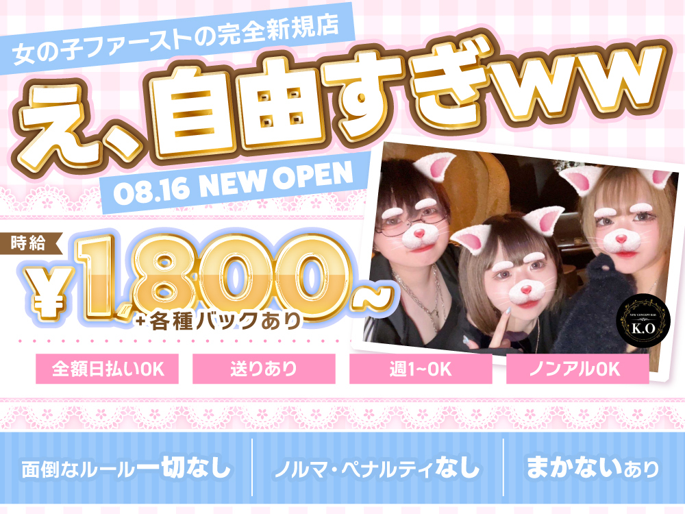 🌟8月16日に南越谷・蒲生エリアで新規OPENした「NEW CONCEPT BAR KO ~ケーオー~」は、超自由な環境で働ける初心者さん応援店舗です🎉✨オープニング採用率は驚きの99%❗️未経験でも大歓迎で、面倒なルールやノルマも一切なし😉🌈普段通りの私服でOKで、シフトも週1日から柔軟に対応。時給1,800円+高額バックで頑張り次第で高収入が狙えます💰送りや賄いも完備で、安心して働けますよ🚗🍳応募は24時間いつでもOKです👯♀️💖
