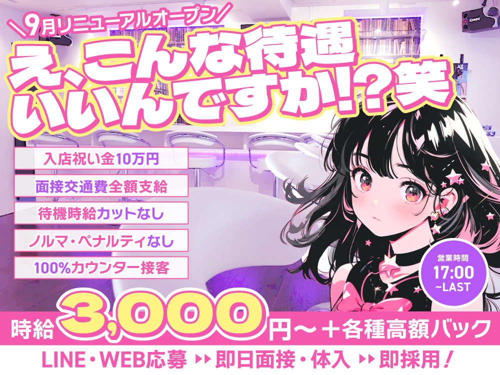 \見学・体験入店受付中/ お店の気になる点を じっくりチェックできますよ♪ ビックリするくらいに気さくな ママやお客様の様子も その際に確かめてみましょう! 当店でお仕事を始めるなら リニューアルしたばかりの 今が絶好のチャンスです◎ お友達と一緒のご応募も大歓迎! 少しでも興味がある子は お気軽にご連絡ください◎