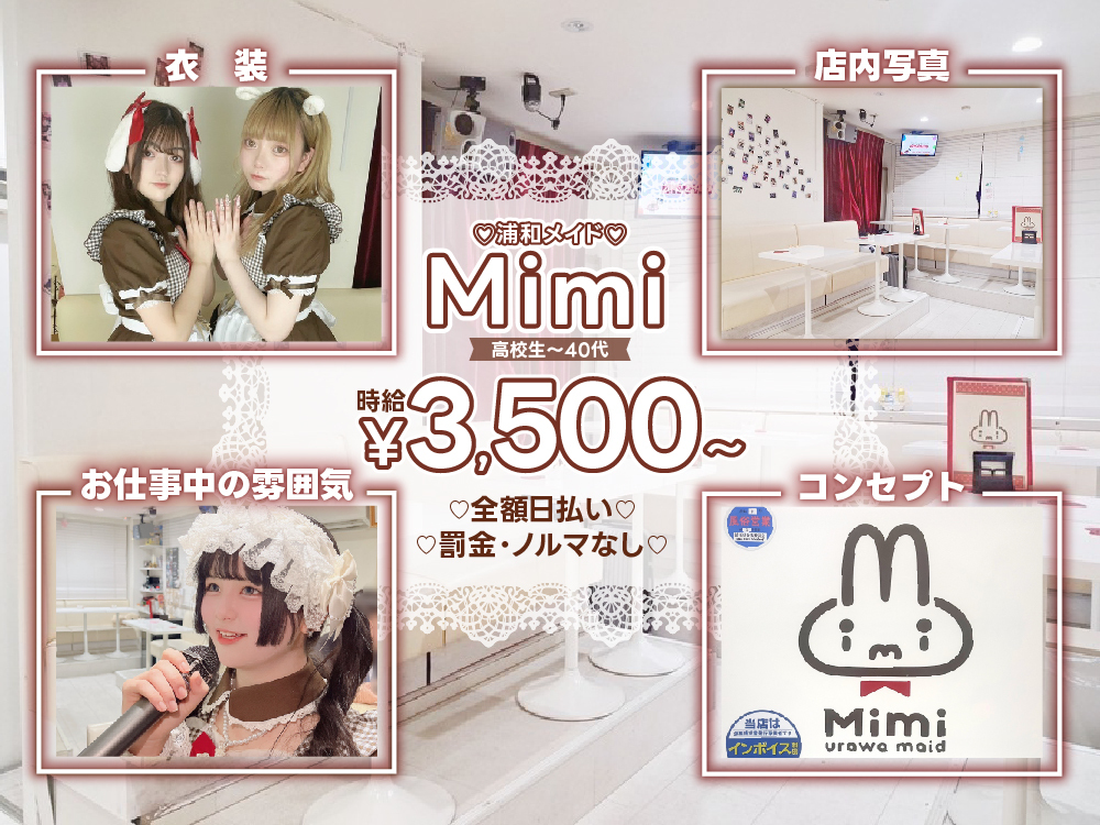【🍬浦和で超大人気店がGRAND OPEN🎀】コンカフェMimi~ミミ~はウサギメイドがコンセプト💖未経験でもかわいい制服で楽しくお仕事🎀アイドルデビューも可能💕自由なヘアスタイル・ネイルOK🌈全額日払いでしっかり稼げ、昇給昇格あり✨送りあり🚖常識的なお客様ばかりで接客もノンストレス😊優しい女性店長と仲良しスタッフ👯♀️男性スタッフに言いづらいことも友達感覚で相談OK🆗WワークもOK、手荷物はゼロ🎒ストレスフリーにお仕事できる環境提供、ノルマ・ペナルティー一切なし‼️まずは体験入店から💌お待ちしております💕
