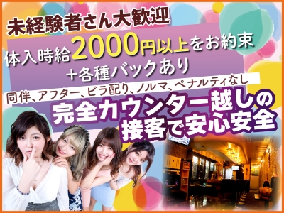 ⭐️2022年2月新規オープン⭐️1期生大募集中⭐️未経験大歓迎 ⭐️経験者優遇⭐️広々とした店内⭐️私服勤務OK⭐️ ⭐️送り有り⭐️週1~3h~勤務OK⭐️日払いOK ⭐️各種バックあり⭐️ピアス・タトゥーOK ⭐️Wワーク大歓迎⭐️学生さん大歓迎⭐️フリーターさん大歓迎 ⭐️カウンター越しの接客⭐️終電上がりOK ⭐️派閥等一切なし⭐️ゆるーく働ける