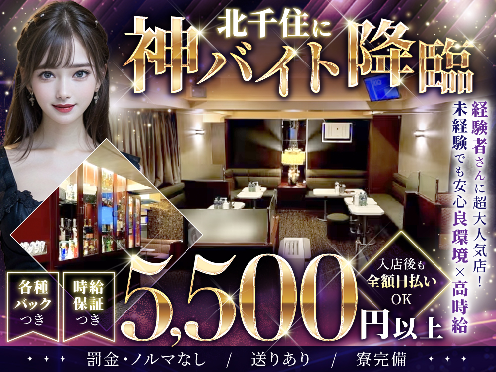 ✨club Grace(グレイス)✨では新しい仲間を大募集中!北千住駅徒歩2分の好立地で、20代〜40代まで幅広い年齢層が活躍しています💖ラグジュアリーな内装の姉系ラウンジで、未経験者も大歓迎🌟時給4,000円~+高額バックあり、自由シフト制でプライベートも充実💃送りサービスもあって出費ゼロ!ノルマや強制は一切なしでストレスフリーに働けます🎉気になる方は体験入店からどうぞ!あなたの加入を心よりお待ちしています💕