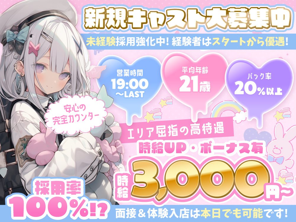 ✨【2022年8月完全リニューアルオープン】✨♡【女の子ファースト】のお店!!今ならほぼ採用☆ビラ配りなし⭐️バック率は驚異の50%◎その他にも高待遇がいっぱいです❤️ ⭐️未経験者さん大歓迎 ⭐️経験者さんは前店給与考慮します ⭐️学生さん大歓迎 ⭐️OLさん、Wワークさん大歓迎 ⭐️体験入店は全額日払いOK 日払いOK ⭐️ノルマなし ⭐️完全自由シフト制 ⭐️髪型・ネイル・ピアス自由 ⭐️WワークOK ⭐️駅チカ!30秒! ⭐️お酒が飲めなくてもOK ⭐️各種高額バックあり ⭐️私服OK