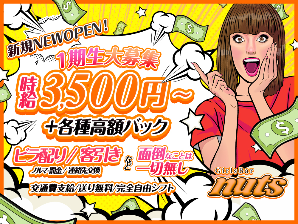 💖『GirlsBar nuts』は未経験からのスタートも応援します🎉私服勤務&ピアス・タトゥー・髪色自由であなたらしく働ける💃自由シフトで学業やWワークとも両立楽々✨ナイトワークの面倒なルールはナシでストレスフリー😊ドリンク提供や楽しいトークで盛り上げるだけのシンプルなお仕事で未経験でも始めやすい♪友達同士の応募も大歓迎👯♀️このチャンスをお見逃しなく💕