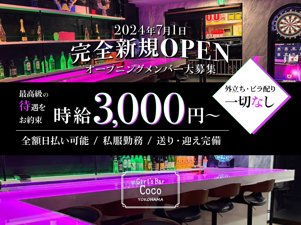 2024年7月1日、関内エリアに新規オープンするガールズバー「Girl’s Bar CoCo」では、オープニングキャストを大募集しています✨ピカピカの店内で働きたい方、一期生としてフラットな人間関係で始めたい方にピッタリ💖高時給3,000円~+各種高額バックで、全額日払いOK💰面接交通費支給&即日勤務OK✨罰金・ノルマなしで、ストレスなく楽しく働けます🎉駅からのアクセスも良好🚉詳細はぜひ記事をチェックしてね💕
