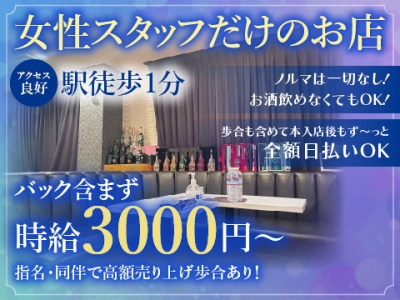 ✨時給3000円〜✨全額日払い✨各種歩合あり✨不明瞭な天引き一切なし✨お酒が飲めなくてもOK✨未経験者大歓迎✨経験者には特別待遇あり✨シフトカットや待機時給カットなし✨送りあり✨終電上がりOK✨完全自由シフト制✨週1日/1日3h~OK✨短時間勤務OK・WワークOK✨女性スタッフだけのお店✨個人ロッカー完備✨ドレス無料レンタル✨髪型・髪色・ネイル・アクセ自由✨ビラ配りなし✨ノルマや罰金一切なし✨即日体入OK✨何度でも体入OK✨お友達ともOK