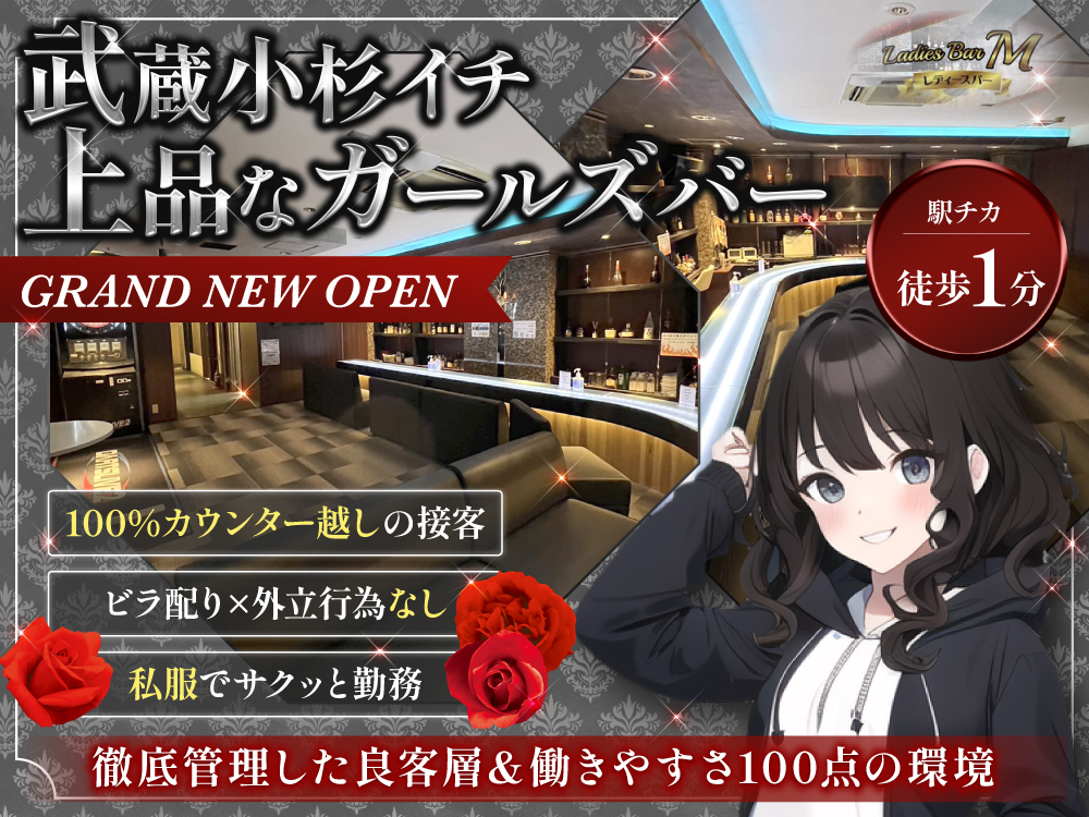 🥂新オープンの上品なガールズバー『Ladies Bar レディースバーM』武蔵小杉で大募集中💕時給2,500円~+最大30%バックで稼げるチャンス!完全自由シフトでWワークや学生さんも大歓迎📅ノルマ・ペナルティなしで安心して働けます🌟ビラ配り・キャッチ行為もなく、100%カウンター越しの接客🍸落ち着いた空間で上質に働ける上、私服勤務OK👗新規オープンで一緒に盛り上げてくれる仲間を大募集🎉お問い合わせ・質問だけでも歓迎💕友達同士もお気軽にご連絡を~(´꒳`)❤
