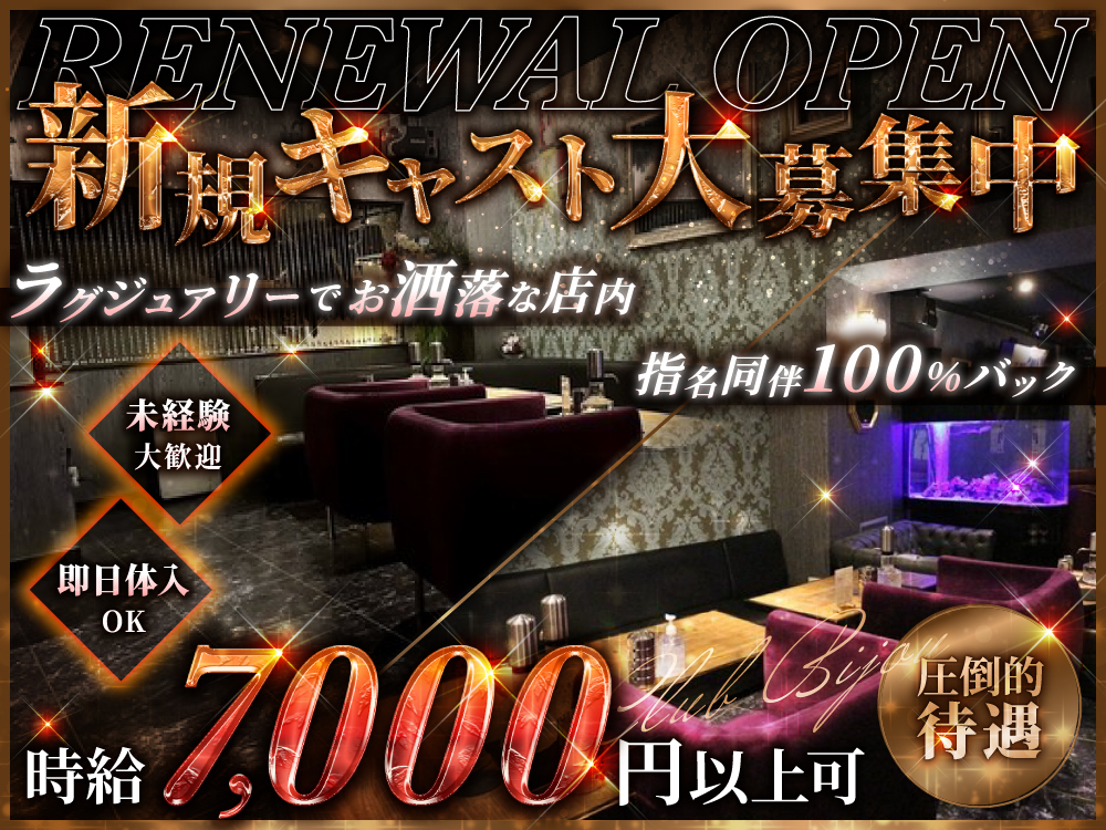 💖bijou〜ビジュ〜は、稲田堤の洗練されたキャバクラ🎀リニューアルオープンで新メンバー募集中🌟時給は3,000円〜7,000円+αの豊富なバックでしっかり稼げます💰全額日払いも可能👍オシャレなドレスとヒールは無料レンタル👠楽しいフリートークやお客様のご案内が主なお仕事👸初めてでも安心、スタッフがしっかりサポートします🤗体験入店も何度でもOK、自分のペースでお仕事を覚えていけます✨友達と一緒に応募も大歓迎!あなたもビジュの一員に💖