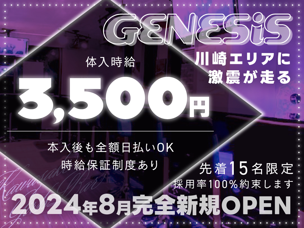 🌟8月5日にグランドオープンするGenesisが、オープニングメンバーを大募集しています!🌟川崎駅から徒歩3分の好立地で、未経験でも体入時給3,500円以上💰さらに、昇給や高額バックもあり、日払いも可能です✨美容手当全額支給(条件あり)やノルマ・罰金なしで、働きやすい環境です🙅服装や髪型も自由で、おしゃれを楽しみながら働けます👗シフトは週1日からOKで、未経験者も大歓迎🔰ぜひご応募ください❣️