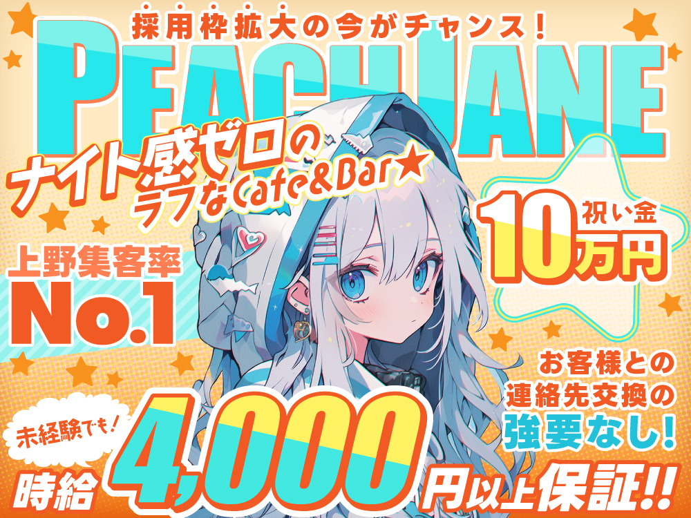 ガルバなのにナイト感ゼロ! 上野駅から歩いてすぐの 仲町通りにNEWOPEN🎉 新メンバー大募集中! 🎀PEACHJANE🎀 近年、コンカフェが流行ってる中で 私服でラフに働ける cafe&barのような ガールズバーです♪ そんな《PEACHJANE》は ・在籍の75%が未経験 ・20第~30代と幅広く活躍中 ・Wワークの方が多数 のように在籍しやすい環境が 整いまくってます♪ そんなPEACHJANEが 採用強化中の今だけ! 入店祝い金10万円 ご用意してお待ちしています💕