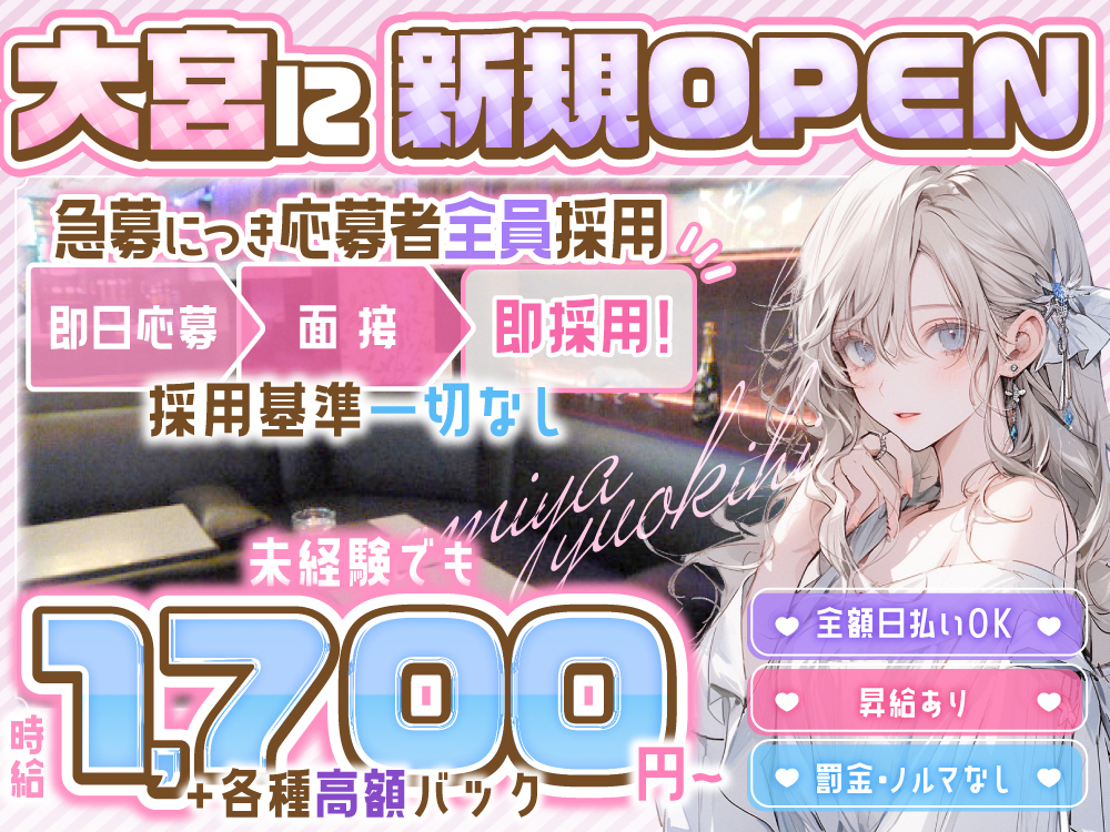 🔮【楊貴妃~ヨウキヒ~】🔮大宮駅から徒歩4分の好立地で、雨の日も安心して通勤可能🌈🎉活躍中のスタッフは20代後半〜30代の女性で、紳士的なお客様が多く、落ち着いた雰囲気で働けます💕私服勤務OKで、自分らしく個性を活かせる職場👗完全自由シフトで、テスト期間のシフト調整も可能🙆未経験者でも時給1,700円〜スタートで、全額日払い・週払いから選べる柔軟な給与体系💰未経験の方でも安心して始められる環境🌟お気軽に面接へお越しください♪体験入店も随時受付中!履歴書不要🌟
