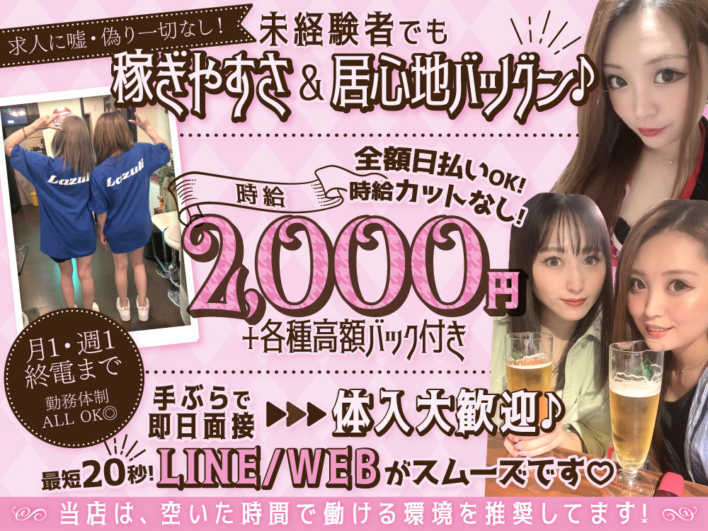 ❤️未経験の方も大歓迎! ⭐️経験者の方は優遇あり! ❤️学生・OL・フリーター・Wワークの方大歓迎! ⭐️お酒が飲めなくてもOK! ❤️お友達同士のご応募も大歓迎! ⭐️全額日払いOK ❤️終電あがりOK ⭐️3h以内の勤務OK ❤️髪型、髪色、ネイル、ピアス自由 ⭐️履歴書不要 ❤️完全フリーシフト制 ⭐️即日体入OK