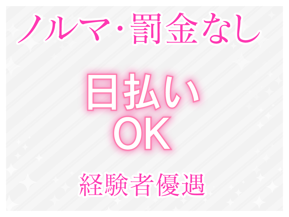 ❤️未経験の方も大歓迎! ⭐️経験者の方は優遇あり! ❤️学生・OL・フリーター・Wワークの方大歓迎! ⭐️お酒が飲めなくてもOK! ❤️お友達同士のご応募も大歓迎! ⭐️全額日払いOK ❤️終電あがりOK ⭐️3h以内の勤務OK ❤️髪型、髪色、ネイル、ピアス自由 ⭐️履歴書不要 ❤️完全フリーシフト制 ⭐️即日体入OK