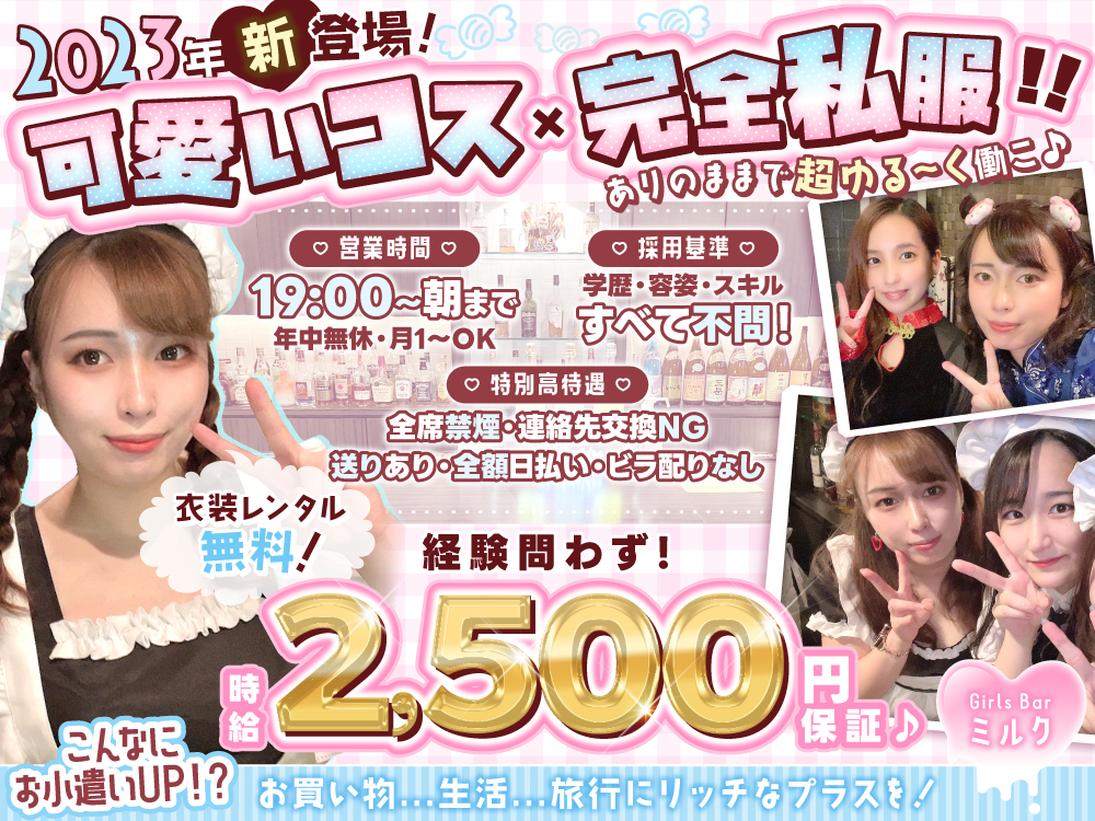 超ゆる~く働けるミルク🌟では新メンバー大募集中💖!時給は2500円以上で日払い・月払いも可🌸交通費も支給👌女友達とのカフェのような雰囲気で、フレンドリーでリラックスできるお店🎶シフト超フレキシブル、未経験者・Wワーク歓迎🎉お酒不要💬客引きなし😌高額バック+バック率50%💰服装は自由、ノルマや罰金は一切なし🌈女性店長在籍で新人も安心💓おしゃべり好きや友達との勤務も大歓迎🤗八王子で新たなチャプター、スタートしませんか🌟?お気軽にご応募✉️、#girlsbar milk〜ミルク〜で素敵な思い出を💖!