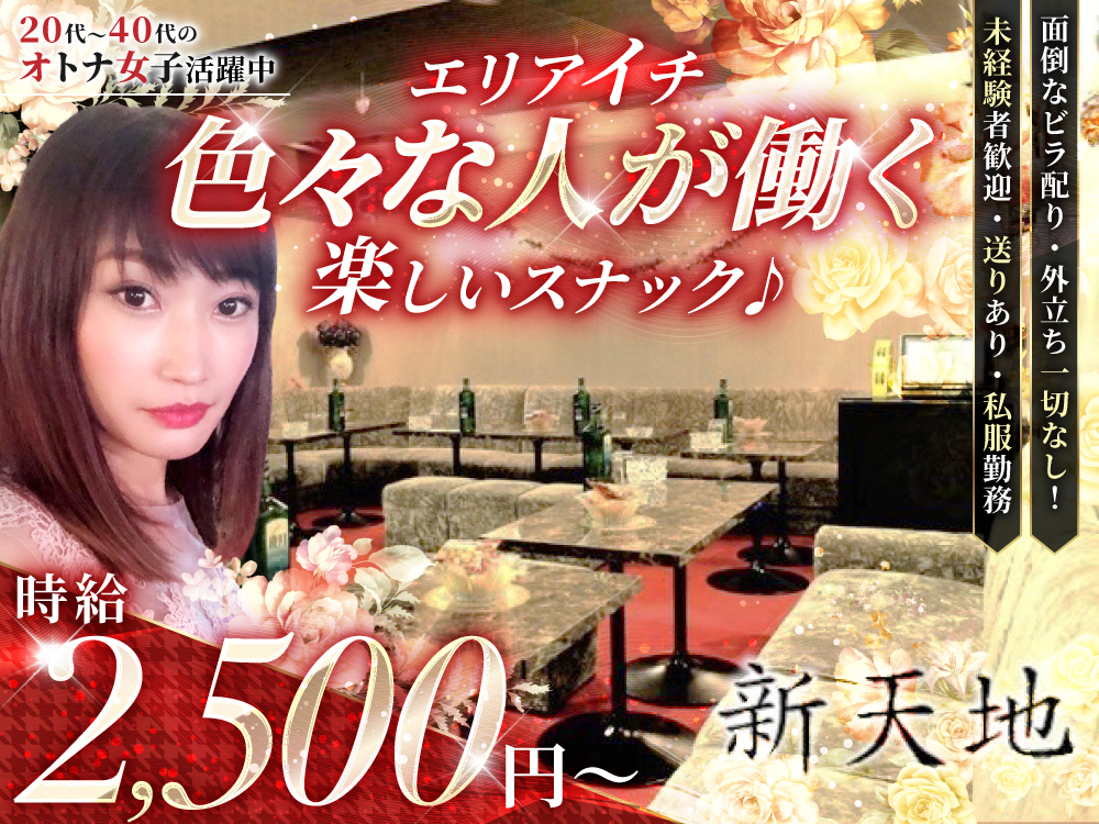 八王子駅から徒歩5分のスナック「新天地」は、女性店長がいるアットホームなスナックです🌸未経験者も大歓迎で、現在採用強化中!体入時給2,500円~、各種高額バックありで、随時昇給制度も完備✨お仕事内容は、ドリンク作成とお客様とのおしゃべりだけの簡単なものです🍹ノンアル営業OKで、お酒が飲めなくても大丈夫🙆外立ちやビラ配り、ノルマ・罰金もなく、安心して働けます🚗シフトは週1日~、1日3時間~OKで、私服勤務もOK👗まずは体験入店から始めてみませんか?気軽にご応募ください😊