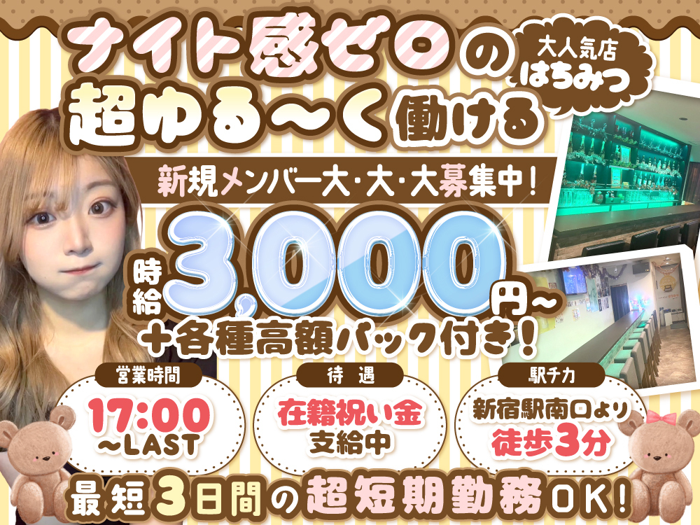 🌟新宿でおすすめコンカフェ🌈《はちみつ》時給3,000円~の高収入&日払い・月払い可能🤑完全自由シフト制で、週1日~、1日3時間~OK✨私服勤務で自分らしさを大切に💃簡単なドリンク作成・提供で楽しく働ける🍹終電上がりOK、安心の職場環境🏠友達との応募も歓迎、ノルマ・罰金なしでストレスフリー💕即日体入可能で、楽しい職場の雰囲気を体験しよう😊💥新たなスタート、ここで切り開いてみませんか?💁♀️
