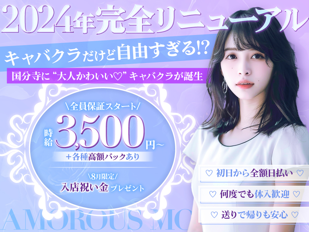 💖【国分寺キャバクラ「CLUB AMOROUS MO」】💖で働きませんか?💁♀️未経験者さんも大歓迎で、業界完全未経験でも積極採用中です✨経験者さんは前店の待遇を考慮して優遇❗️時給は安心の保証付き3,500円スタート🎉入店祝い金2万円贈呈🎁日払い可能でお給料はその日に持ち帰れます💸お客様とのおしゃべりが主な仕事で、ノンアル接客もOK🍹安心の治安&客層、終電や夜道も安心の送り付き🚗シフトは自由で、週1日・1日3時間から働けます✨応募条件は経験問わず、学生さんやWワークも歓迎💖履歴書不要で即面接もOK🙆♀️体験入店や見学も大歓迎❗️お気軽にお問い合わせください📲