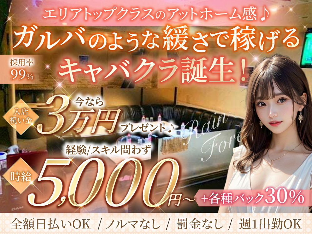 Rain Forest~レインフォレスト~🍃未経験者大歓迎!体入時給5,000円以上💰全額日払い&今なら入店祝い金3万円贈呈🎁各種高額バックも盛りだくさん💫お酒飲めなくてもOK🍹週1勤務、1にち3時間~OK◎制服無料レンタル👗送りも無料🚗💨フリートークのみでストレスフリーに働けます🌿シフト完全自由!早上がり・終電上がりOK🚄友達と応募も大歓迎👭ノルマ・罰金一切なし😇新しい仲間と素敵な時間をレインフォレストで過ごしませんか?💖24時間受付中!お問い合わせお待ちしております📱