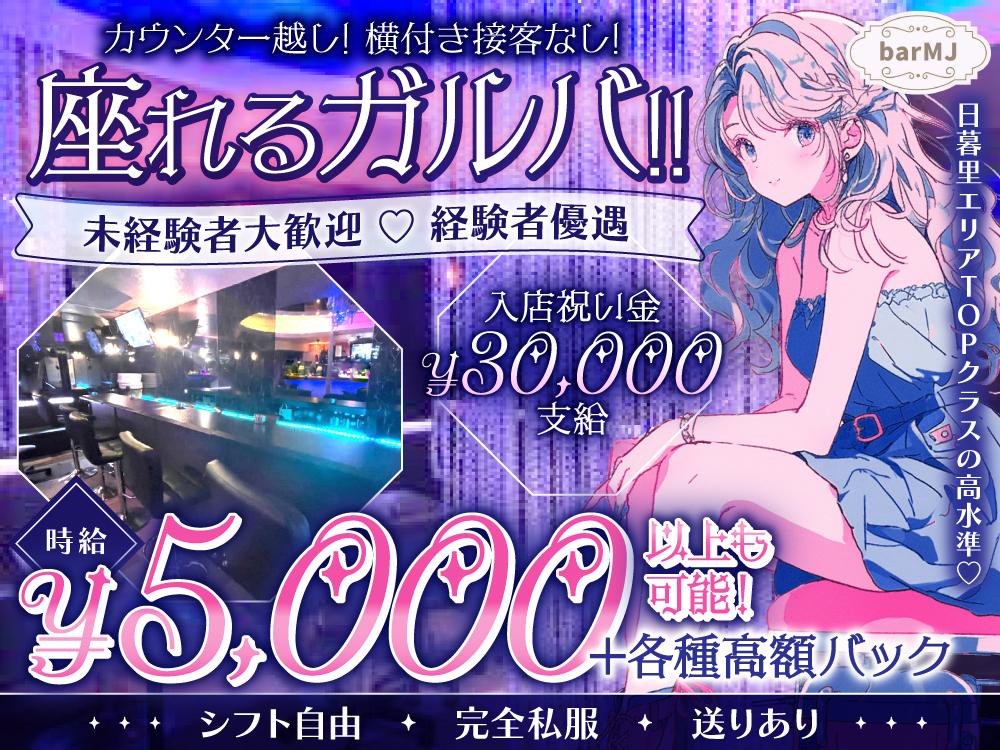 🌟日暮里にNEW OPENのbar MJ🌟駅チカで治安も良く、今なら入店祝い金として3万円プレゼント中✨ゆったり座って接客できるので疲れ知らず😊時給は業界トップクラスの5,000円以上も可能!全額日払いや各種バックUPもあって稼ぎやすさ抜群💰私服勤務OKで、気分に合わせてスタイルチェンジも👗完全自由シフトでライフスタイルに合わせて働けるからプライベートも充実💖経験不問、未経験者には丁寧なサポートあり🙆♀️友達との応募も歓迎だから、気軽に体験入店してみてね💕