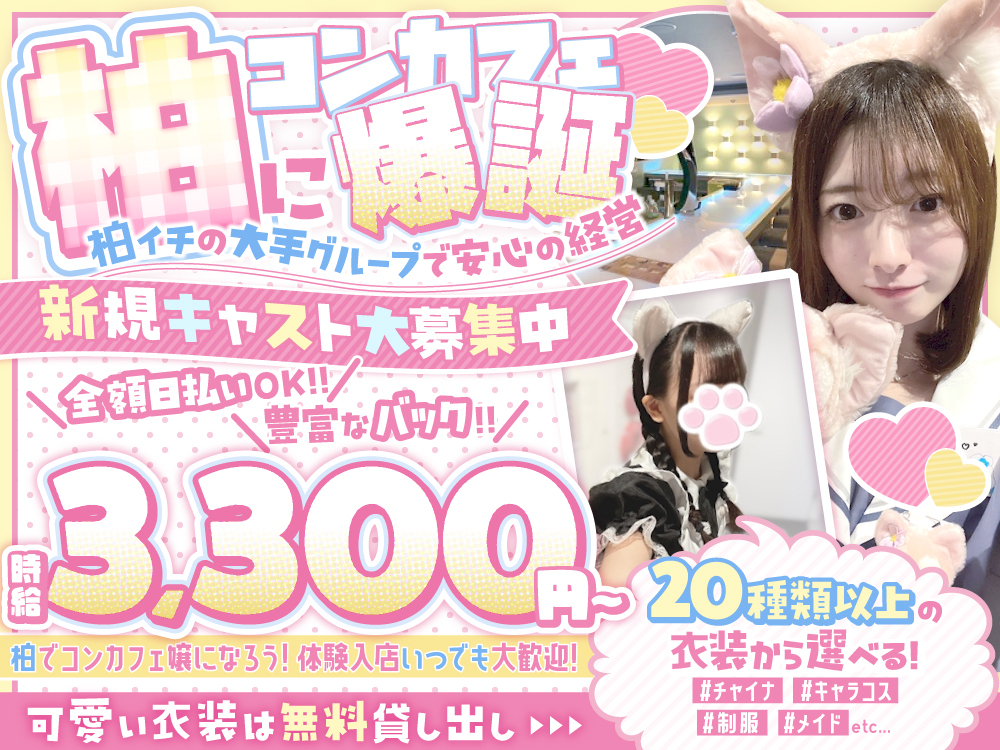 🌟新店トゥイーティーズ🌟柏エリアで話題沸騰中😍10月グランドオープン!限定オープニングキャスト大募集中🥺💖時給3,300円から、バック率も高く、めっちゃ稼げる💰✨好きなコスプレで楽しく、完全自由シフト制でストレスフリーにお仕事🎀SNS生配信も👀全額日払いOK!お仕事用の衣装は20種類以上から自由に選んで、無料レンタル👗体験入店何回でもOK、ノルマ・罰金一切なし🚫💙未経験者でも大歓迎🌈一緒に楽しい時間を過ごしましょう🌟お気軽にご応募ください💖