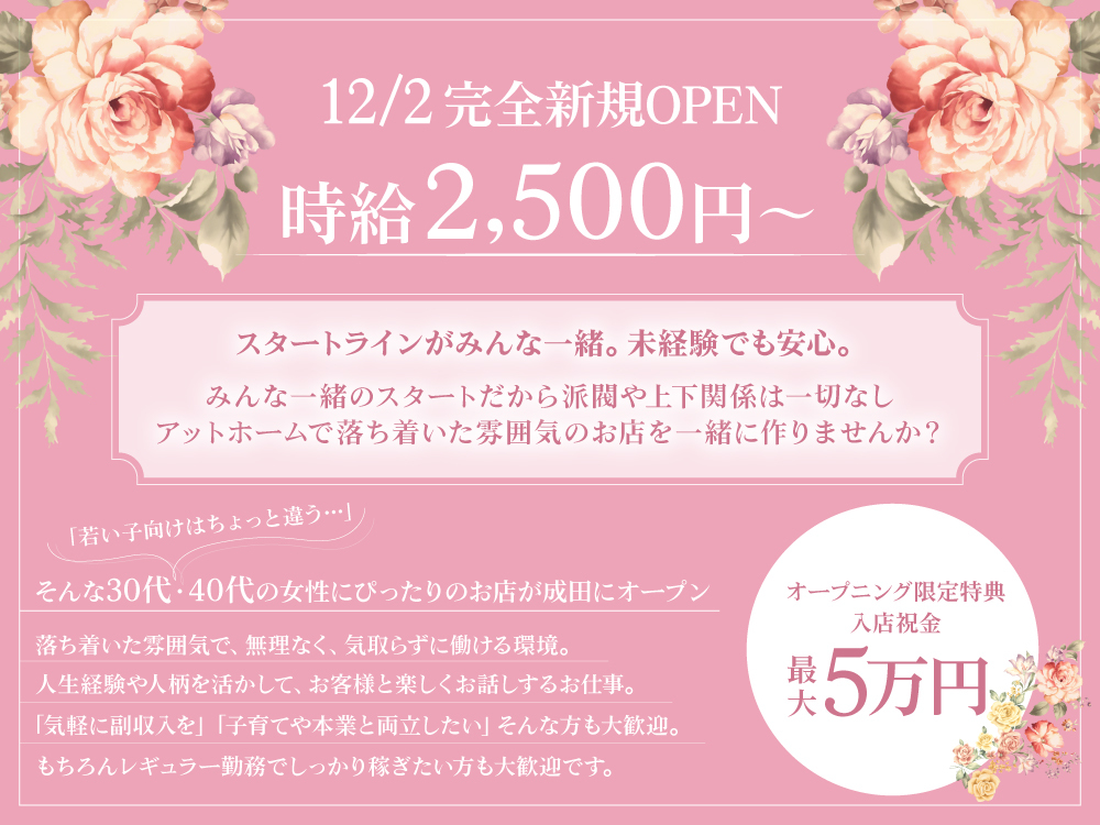 成田駅スグに12/2にOPENする大人の隠れ家スナック【SNACK Lumiere】で、フロアレディさんを大募集しています🥂特落ち着いた雰囲気のお店です🌷時給2,500円~で各種バックがあり、さらに最大5万円の入店祝い金をご用意!全額対応で稼ぎやすさは抜群💸罰金・ノルマは一切なし🙅♀️完全自由シフトで週1日3h~OK、終電上がりや送りもあり、Wワークや主婦さんも働きやすいですよ⏰私服勤務OKで、お客様との連絡先交換もなしなのでプライベートも安心です🛡️未経験者さんもブランクさんも大歓迎!優しいママと一から楽しくお店を作りませんか?まずは体験入店でお店の雰囲気を見てみてくださいね💖