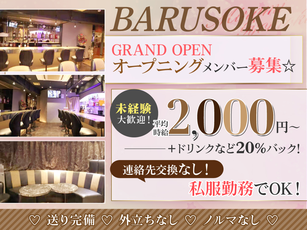 【BARUSOKE】は、スナックの安心感とガールズバーの高還元バックを両立した注目店です✨ 時給2,000円〜+20%以上のバック💰 20代〜40代まで幅広く募集中で、ノルマ・罰金・連絡先交換は一切ありません❌ 私服勤務OK、さらに送り完備で帰り道も安心です🚗 完全カウンター接客&ノンアルOKだから未経験さんもリラックスしてスタートできます🍀 定員に達し次第終了の限定募集なので、まずは体験入店でお会いしましょう🎵お待ちしております💌