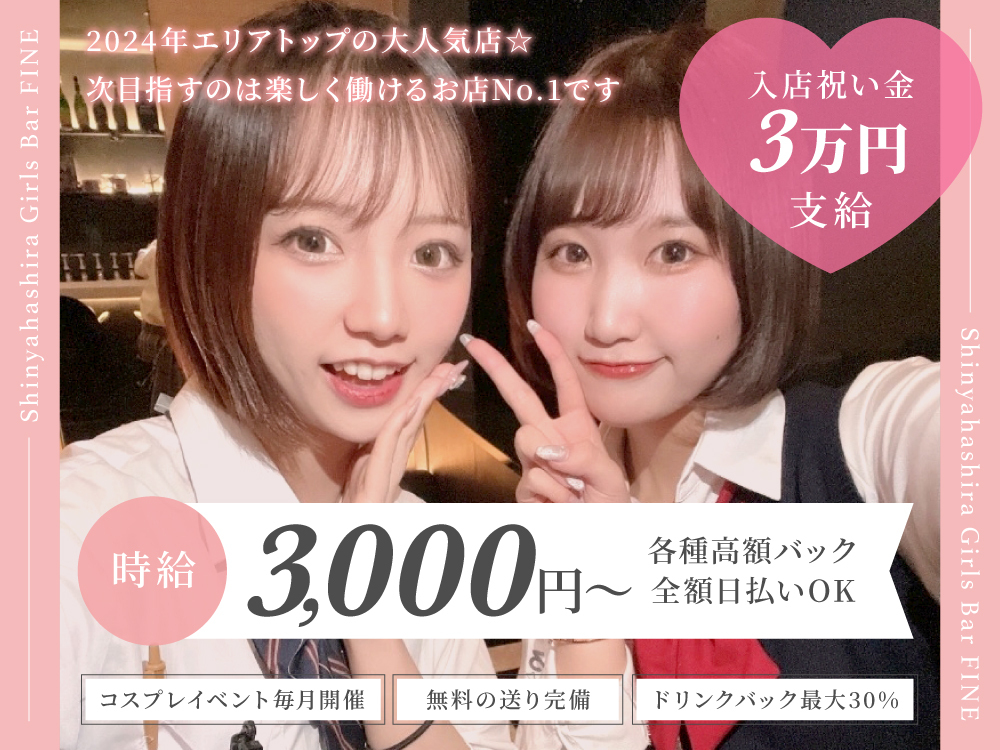 BAR FINEは松戸八柱エリアでトップクラスの大人気スナックです🌟只今大繁盛中につき一緒に働いてくれる女の子を大募集しています💓未経験者大歓迎入店祝い金3万円🎁支給や時給3000円以上も可能です✨露出0のYシャツ&タイトスカートの制服で毎月コスプレイベントも楽しめます🎉面接交通費支給や日払いOK無料の送り完備など高待遇がいっぱい🚗働きやすさ抜群で派閥や上下関係もなし😊興味のある方はぜひ応募してくださいね📱