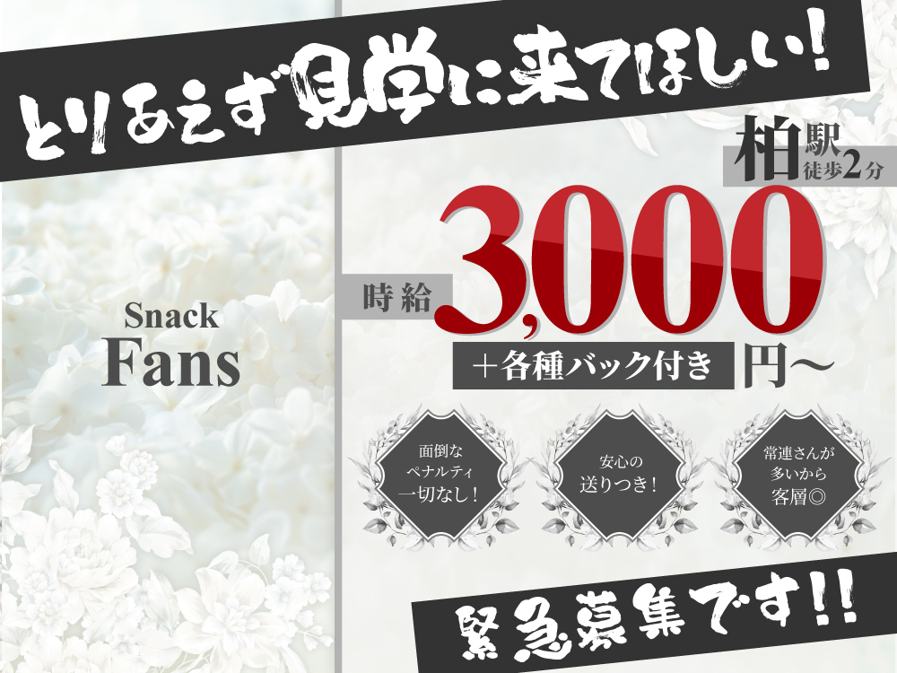 ✨【完全紹介制】のスナック「Snack Fan's」で一緒に働きませんか?✨ 経験・年齢不問で未経験者も大歓迎🌸お店の自慢は【良質な客層】で、ノルマやペナルティなし。ノンアルコールOKなので、無理せず楽しく働けます🍹短期で始めたのに、居心地の良さで長く続けるスタッフも多数✨ 時給3,000円以上で、昇給やバックもあり💰私服勤務OKで自由なシフト制なので、学生や主婦にもぴったり👍体験入店も随時受付中です!気軽に応募してくださいね😊