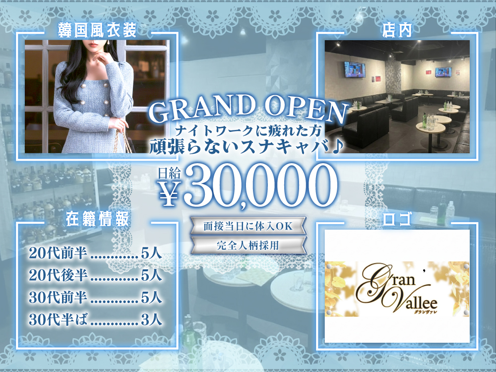 千葉・葭川公園駅からすぐ✨ 5/1リニューアルOPENのスナキャバ【Gran Vallee〜グランヴァレ〜】🍸 20代後半~30代後半のお姉さん世代が活躍中💖 未経験さんも大歓迎!時給6500円~、日収3万以上可能💰 全額日払いですぐにお給料GET👍 ノルマ・罰金・キャッチ一切なし🙅♀️ 自由シフト制で週1/3h~OK◎私服OK、ヘアメイク不要、ドレス無料レンタルあり👗 連絡先交換なし&お酒飲めなくても大丈夫🥂 送り、寮、託児所も完備🏡 まずはお気軽に手ぶら体入へ🌸 体入時給5000円も当日全額日払い!