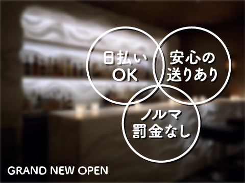 ☆入店祝い金 3万円プレゼント中☆ナイトワーク感が全然ないので、まるでカフェのようなお店です( ´ ▽ ` )オープンしたばかりなので、たくさんのお客様が来店しやすく稼ぎやすいですよ!また新しいお店だからこそ、自分色の雰囲気を作れちゃいます♪お酒は飲めなくても大丈夫◎ノルマがないので、ソフトドリンクでもいいんです♪♪体を壊すことなくお仕事出来ますよ♡学生さん、Wワークさん、フリーターさんどなたでも大歓迎