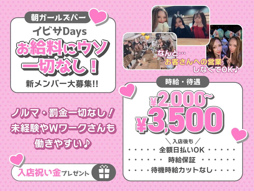 池袋の朝ガールズバー「イビザDays」で新規スタッフ募集!☀️時給2,000円〜3,500円で時給保証&待機時給あり💰私服勤務OKで、髪色・ネイルも自由です💅ノルマ・罰金なし、入店祝い金や毎月の皆勤手当など充実の待遇✨朝・昼中心なので常連さんが多く、身内バレの心配も少なめ!駅チカで雨の日も通勤ラクラクです☔️未経験者、学生、Wワーク大歓迎!友達との応募や、何度でもOKな体験入店から始めてみませんか?💌✨