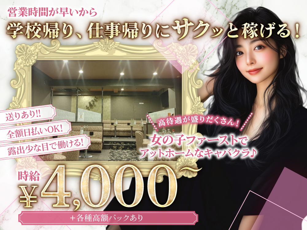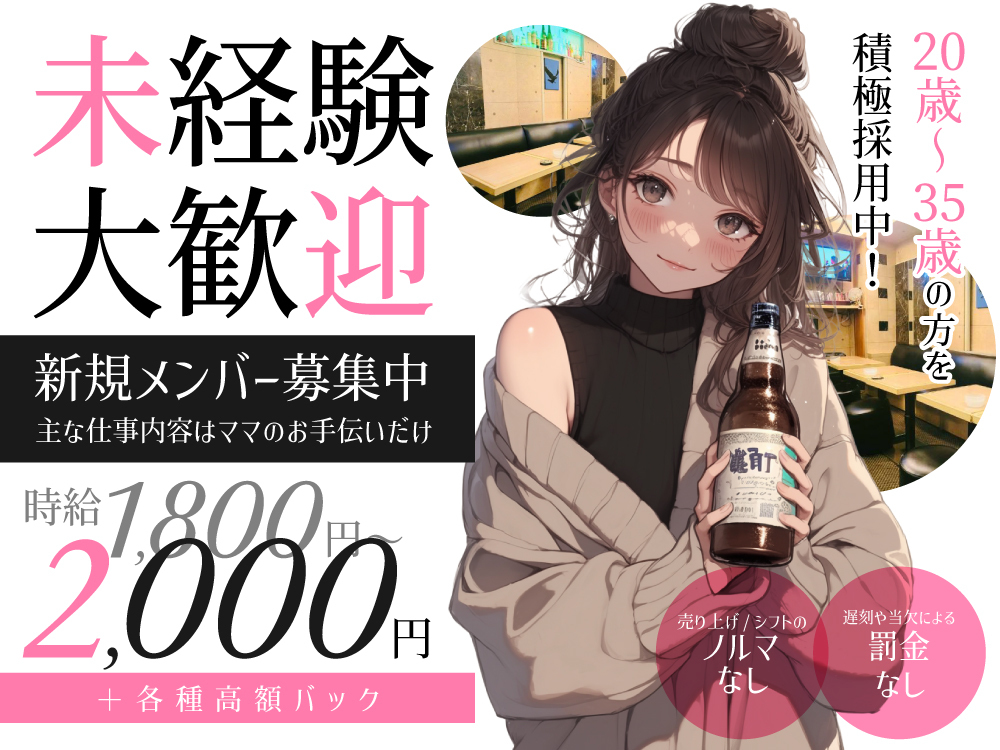 \ナイトワークデビュー歓迎/未経験でも安心して始められる環境です✨20代から40代の女性が活躍中で、容姿や年齢、経験は一切不問!💃お酒の知識がなくてもOK🙅、周りのサポートも充実しているので、すぐに慣れますよ🎶カラオケ好きならさらに楽しく働けるかも🎤自由なシフトや私服OKのカジュアルな雰囲気も魅力🌈時給1,800円~2,000円+各種手当でしっかり稼げて、その日に全額日払い可能💰ぜひお気軽にご応募ください📩