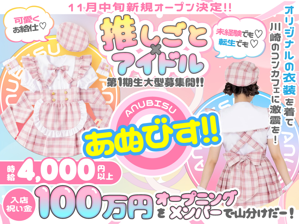 川崎エリアに新しくオープン予定のコンカフェ「アヌビス」で、一期生を大募集🎀💫アイドル風の可愛い衣装で毎日着せ替え感覚を楽しめるお給仕ができちゃいます💕未経験でも時給4,000円スタート💰で、ノンアルOKのドリンクバックあり🍹自由シフト制で学生さんやWワークの方にもピッタリです✨上下関係なしの完全新規オープンなので派閥も気にせず働ける環境が魅力💖今がチャンス、ぜひ気軽に応募してくださいね📲💕