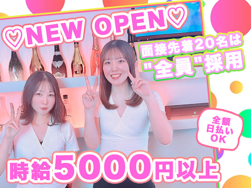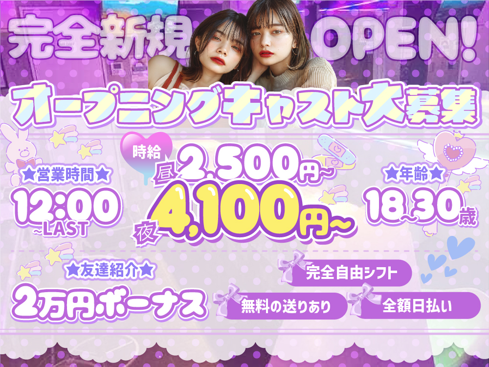 2024年11月完全新規OPEN✨ 在籍キャストゼロからのスタートで、 派閥や上下関係がなく、同期みんなで一緒に始められます🎉 💎入店祝い金5万円💎 ホテルのような高級感ある内装で、 落ち着いたお客様ばかり♪♪ 未経験でも安心して働けますよ✨ 服装自由やシフト自由、短期や単発もOK! 急なシフト変更も柔軟対応✨ 全額日払い・アフターなし💖 時給3,000円〜で各種バックも充実🎶 応募は新規OPENの今がチャンス❕💖 登録制・短期でのバイトも受け付けております♪♪