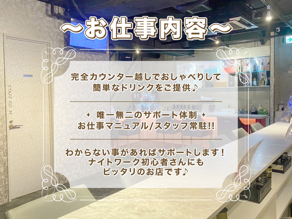 未経験者歓迎、 経験者優遇、 Wワーク歓迎、 週1出勤OK、 月1出勤OK、 終電あがりOK、 土曜日営業、 日曜日営業、 祝日営業、 送りあり、 面接交通費支給、 ニューオープン、 個人ロッカーあり、 連絡先交換なし、 駅から5分以内、 お酒飲めなくてもOK、 友達と応募OK、 即日勤務可能審査確認情報