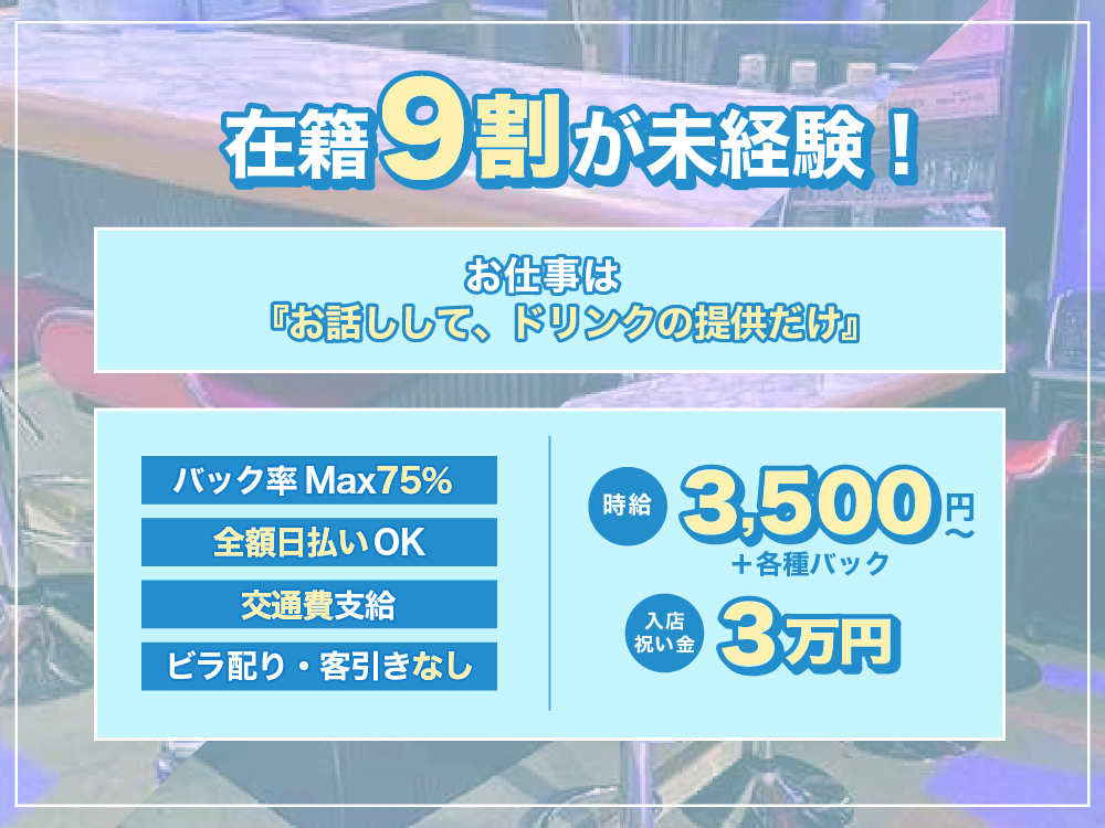 未経験者歓迎、 経験者優遇、 Wワーク歓迎、 週1出勤OK、 月1出勤OK、 終電あがりOK、 土曜日営業、 祝日営業、 送りあり、 面接交通費支給、 連絡先交換なし、 駅から5分以内、 お酒飲めなくてもOK、 友達と応募OK、 即日勤務可能審査確認情報