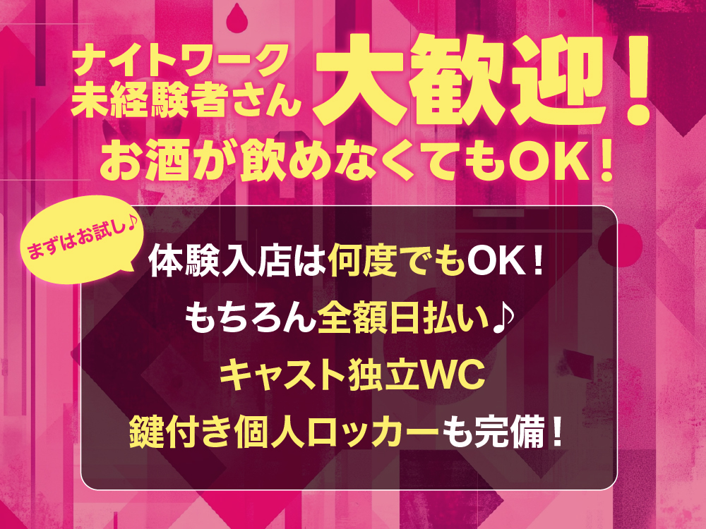未経験者歓迎、 経験者優遇、 Wワーク歓迎、 週1出勤OK、 月1出勤OK、 終電あがりOK、 土曜日営業、 日曜日営業、 祝日営業、 送りあり、 ニューオープン、 寮完備、 個人ロッカーあり、 駅から5分以内、 お酒飲めなくてもOK、 友達と応募OK審査確認情報