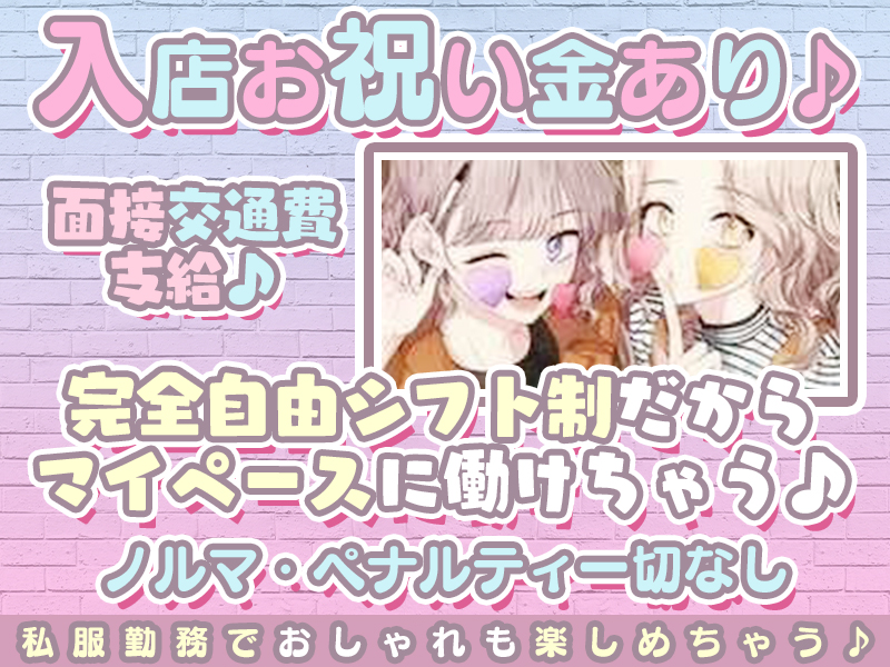 未経験者歓迎、 経験者優遇、 Wワーク歓迎、 週1出勤OK、 月1出勤OK、 終電あがりOK、 土曜日営業、 日曜日営業、 祝日営業、 面接交通費支給、 ニューオープン、 寮完備、 個人ロッカーあり、 駅から5分以内、 お酒飲めなくてもOK、 友達と応募OK、 即日勤務可能審査確認情報