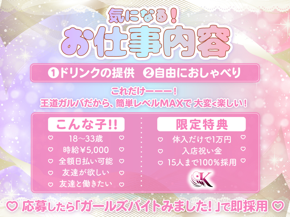 未経験者歓迎、 経験者優遇、 Wワーク歓迎、 週1出勤OK、 月1出勤OK、 終電あがりOK、 土曜日営業、 日曜日営業、 祝日営業、 送りあり、 面接交通費支給、 ニューオープン、 家賃補助あり、 寮完備、 個人ロッカーあり、 連絡先交換なし、 駅から5分以内、 お酒飲めなくてもOK、 女性店長、 友達と応募OK、 即日勤務可能審査確認情報