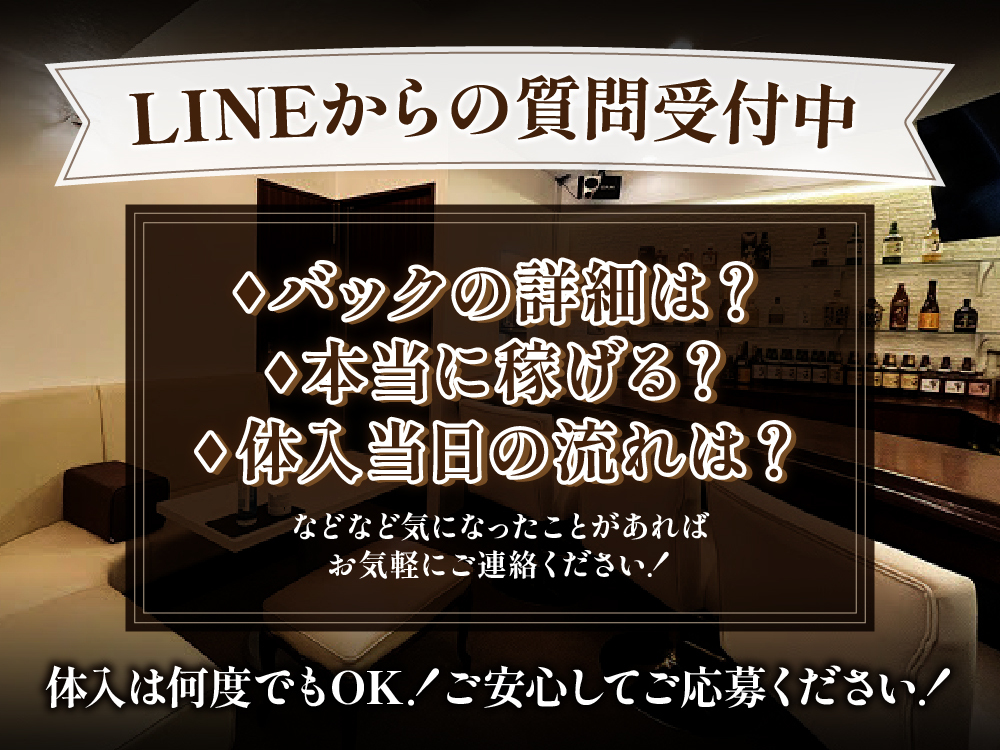 未経験者歓迎、 経験者優遇、 Wワーク歓迎、 週1出勤OK、 終電あがりOK、 土曜日営業、 送りあり、 ニューオープン、 個人ロッカーあり、 連絡先交換なし、 駅から5分以内、 お酒飲めなくてもOK、 女性店長、 友達と応募OK、 即日勤務可能審査確認情報